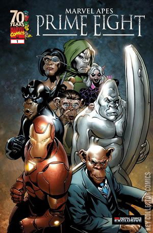 In the face of a fate worse than death, the Ape Universe’s greatest minds and leaders must come together to save their world in a secret council known as – the PRIME EIGHT! BLACK BOLT, king of the Inhominids! The invincible IRON MANDRILL! Bruce Bananner, the incredible HULK! PROFESSOR XAPIER, leader of the X-Simians! CLEOOK, Sorceress Supreme! DR. DOOM, master of Latvookia! SILVERBACK SURFER, Simian of the Spaceways! NICK FURY 2099, time traveling secret agent! Monkhattan stands on the brink of disaster in a story we had to call...APE-OKOPLIS NOW!