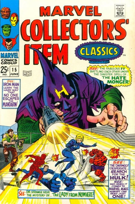 Reprints Fantastic Four 21, Iron Man from Tales of Suspense 55, Hulk, Doctor Strange from Strange Tales 124, and Hulk 1. Cover pencils by Jack Kirby, inks by Paul Reinman. Cover pencils by Jack Kirby, inks by Paul Reinman. "The Hate-Monger!", script by Stan Lee, pencils by Jack Kirby, inks by George Roussos; Nick Fury, now a Colonel in the CIA, enlists the aid of the Fantastic Four against the Hate-Monger even though they are under the control of his Hate-Ray. Fantastic Four illustration, pencils by Jack Kirby, inks by Chic Stone. "No One Escapes the Mandarin!", script by Stan Lee, art by Don Heck; Iron Man escapes the Mandarin and destroys the ray he used to interfere with US missiles; Meanwhile, Happy struggles to keep the company operating in Tony's absence. "The Lady from Nowhere!", script by Stan Lee, pencils by Steve Ditko, inks by George Roussos (as Geo. Bell); Strange finds a woman wandering the streets under a spell; After guiding her to his house, he consults his mentor; Strange travels into the past, though he's warned that if the candle employed in the spell goes out, he will be trapped there forever; In Ancient Egypt, he battles a wizard, Zota. "The Coming of the Hulk Part 3: The Search for the Hulk" featuring Hulk, Rick Jones, Betty Ross, Thunderbolt Ross, and Igor, script by Stan Lee, pencils by Jack Kirby, inks by Paul Reinman. "The Coming of the Hulk Part 4: Enter...the Gargoyle!", script by Stan Lee, pencils by Jack Kirby, inks by Paul Reinman.
