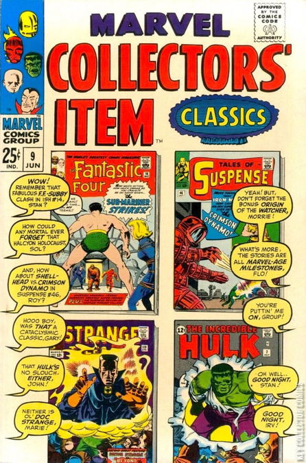 Reprints Fantastic Four #14, Doctor Strange from Strange Tales #119, Iron Man from Tales of Suspense #46 & 53, and Incredible Hulk #2 (Terror of the Toad Men Part 2 and 3). Cover pencils by Jack Kirby (covers & Hulk) and Steve Ditko (Dr. Strange), inks by Dick Ayers (Fantastic Four cover) and Steve Ditko (Fantastic Four cover, Hulk & Dr. Strange). "The Merciless Puppet Master," script by Stan Lee, pencils by Jack Kirby, inks by Dick Ayers; The Puppet Master is declared healed and plans his revenge againt the Fantastic Four; This time, he'll use the Sub-Mariner. "Iron Man Faces the Crimson Dynamo!", script by Stan Lee (plot) and Robert Bernstein (script), art by Don Heck; Khrushchev sends the Crimson Dynamo in the United States to "wreck Stark's project and get rid of Iron Man"; Iron Man defeats the Crimson Dynamo and convinces him to defect. "Beyond the Purple Veil!", script by Stan Lee, art by Steve Ditko; Doctor Strange must rescue two thieves who unwittingly steal a magic gem from him and are trapped in a mystical dimension as a result. "The Way It Began...", script by Stan Lee (plot) and Larry Lieber (script), pencils by Larry Lieber, inks by Paul Reinman; The Watcher comes from a super-advanced race that decides to share its technology with others; When their first attempt ends in tragedy they vow never to interfere with the affairs of less advanced species. "The Terror of the Toad Men Part 2: Prisoners of the Toad Men!", script by Stan Lee, pencils by Jack Kirby, inks by Steve Ditko; The Toad men capture Bruce Banner and bring him to their spaceship. "The Terror of the Toad MenPart 3: Bruce Banner, Wanted for Treason!", script by Stan Lee, pencils by Jack Kirby, inks by Steve Ditko; Bruce Banner is found in a Toad Men crashed spaceship while their fleet arrives on Earth.