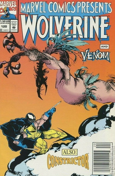Cover art by Sam Kieth. Claws and Webs Part 4: Dreaming With The Enemy starring Wolverine and Venom, script by Howard Mackie, art by Sam Kieth and Dwayne Turner. Doin' The Toe Jam Part 2: The High Road, The Low Road, The Back Roads starring Constrictor, script by Paula Fox, pencils by Mark Powers, inks by Tim Tuohy. And Let There Be Light Part 2: In A Dark Place starring Ghost Rider and Cloak and Dagger, script by Paula Foye, pencils by Alexander Morrissey, inks by Ken Branch. Along Came A Child starring Spider-Man, script by Kieth Plant, pencils by Ed Murr, inks by Chris Ivy. 36 pgs. Cover price $1.50. Wolverine and Venom are still trapped in Nightmare's jungle world. Both Wolverine and Venom survive a fall from a waterfall. Wolverine gets up right away trying to make a mind conection with Professor X while Venom still lies unconcious and is about to be eaten by giant crocs. Wolverine saves Venom. As Venom wakes up Wolverine tells his they should work together to finds out what Nightmare is up to. Wolverine then stabs Venom for throwing Wolverine into a tree earlier. As they run to a girl screaming they find themselves in the way a giant monster.