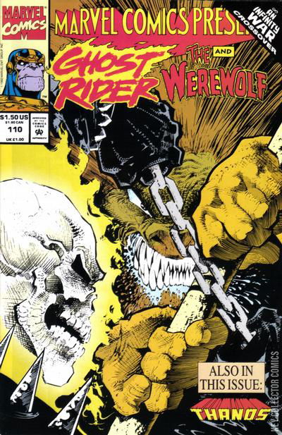 This issue features four stories."Typhoid's Kiss - Part 2: A Killer's Rights" - starring Wolverine and Typhoid Mary"Night of the Ripper" - starring Nightcrawler"Return of the Braineaters - Part Four: Undercover at the Black Moon Bar & Grill" - The Braineaters, a murderous motorcycle gang made up of werewolves, have Ghost Rider chained by his wrists and ankles to four motorcycles. They also hold captive the boy, Billy, who witnessed their crimes, and now force him to watch as the bikes accelerate in different directions. However, the chains give way, and the gang speeds off with Billy before Ghost Rider can give chase. The Werewolf arrives and reverts to Jack Russell, who tells Ghost Rider they need Dan Ketch to find out the gang's whereabouts. Dan's search leads him to the Black Moon Bar, where he does find the Braineaters and Billy. Lupe, a still-human member of the gang, talks to Dan who tells her he thinks she doesn't belong with them. The Braineaters then grab him and drag him into the alley where they beat him."I, Thanos - Part III: Death's dark Domain" - starring Thanos. [Note: this story takes place during INFINITY WAR #3.]