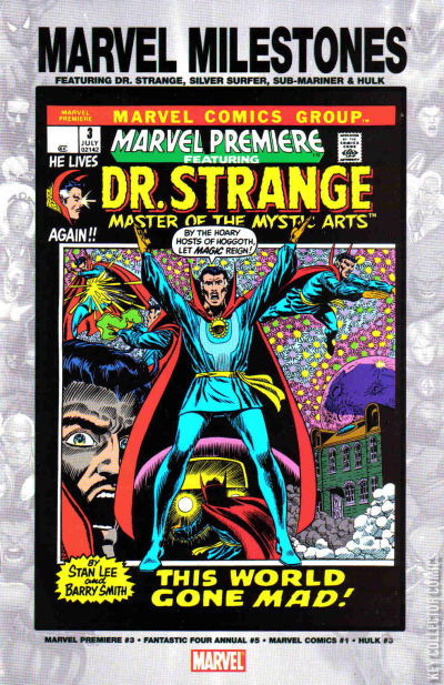 Marvel Milestones featuring the Defenders, Dr. Strange, Silver Surfer, Sub-Mariner and the Hulk in stories reprinted from: Defenders from Marvel Premiere #3. Written by Stan Lee with art by Barry Smith; Fantastic Four Annual #5 with 1st Silver Surfer solo story. Written by Stan Lee with art by Jack Kirby; Sub-Mariner story from Marvel Comics #1; and last but not least, a reprint of a the Hulk's origin story from Hulk #3.
