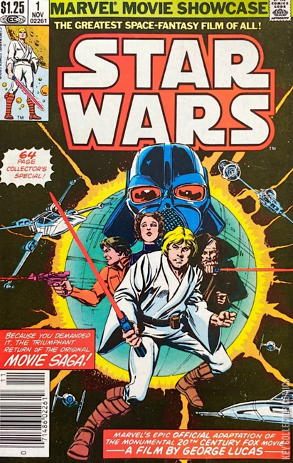 "Star Wars!" Collects Star Wars (1977-1986 Marvel) #1-3. Based on the movie by George Lucas. Adapted by Roy Thomas. Art by Howard Chaykin. This is the official comic book adaptation of the greatest science fiction epic of all time. A long time ago, in a galaxy far, far away a small band of rebels fight desperately to free the galaxy from the evil rule of the sinister Galactic Empire. When a Princess is taken captive by the dark lord of the Sith, it falls upon a young farm boy, an old wise man, a smuggler and his giant wookie companion, and two droids to rescue her. Thus, begins the adventure of a lifetime! 64 pages, FC. Cover price $1.25.