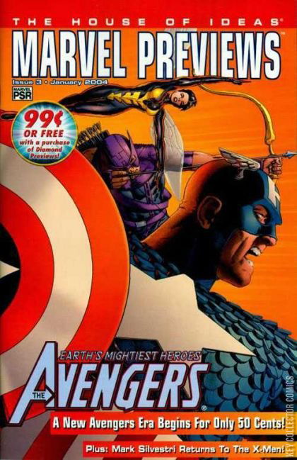 Solicitations for Marvel products shipping in January 2004. Flipbook includes a nine page preview of Uncanny X-Men #437, "She Lies with Angels, Part 1" and a twelve page preview of Captain America (Vol 4) #21, "Homeland, Part One." Indicia reads, "Marvel Catalog: Vol. 7, No. 1 January 2004
