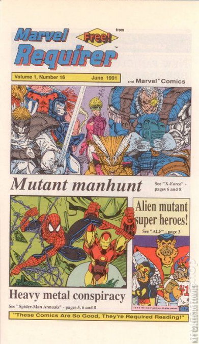 Spotlighted releases for June 1991 include X-Force (mutant manhunt!), ALF #44 (featuring the Uncanned X-Melmen -- alien mutant super heroes!), plus "The Vibranium Vendetta" storyline (heavy metal conspiracy!) running through Amazing Spider-Man Annual #25, Spectacular Spider-Man Annual #11 & Web of Spider-Man Annual #7. 6 5/8-in. x 11 1/2-in.