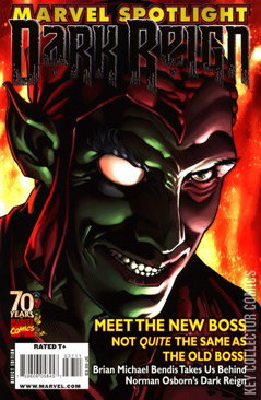 For those of you who have embraced change, it is time for the DARK REIGN. In the aftermath of the Skrull's SECRET INVASION, the Avengers-verse has been rocked to its core. The New Avengers, Mighty Avengers and Initiative have been broken and battered, and now stand to be renewed. But which heroes will remain standing? Who are these Dark Avengers? With insider accounts from your favorite writers and artists, plus previews of new titles, this special issue of SPOTLIGHT gets you ready for DARK REIGN, the storytelling event for the comics industry in 2009!