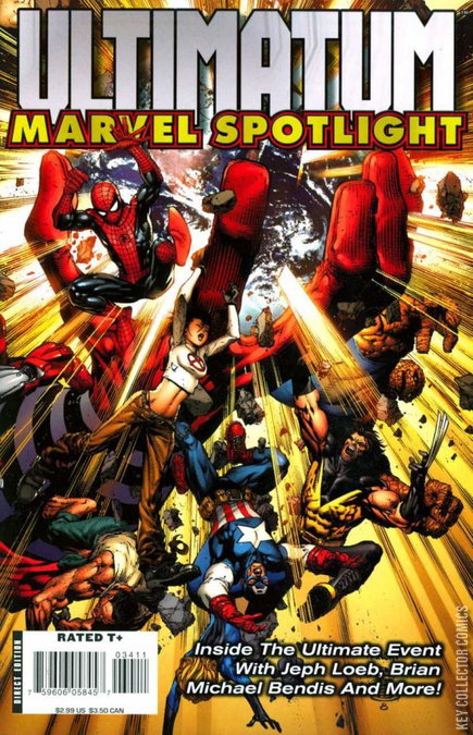 "For what they've done...they must pay the ULTIMATE price..." Spingboarding from the pages of ULTIMATES 3 and ULTIMATE POWER, Jeph Loeb and David Finch's ULTIMATUM is a six-part series that will change the Ultimate Universe in ways as definitively as the Marvel Universe's CIVIL WAR or the X-Men's MESSIAH COMPLEX. MARVEL SPOTLIGHT checks in with the series' principal creators and takes readers inside the universe that changed the rules for comics in the 21st century - and figures out how those rules are going to be rewritten! The end is here, and so is SPOTLIGHT!