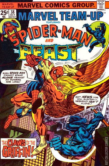 NIGHT OF THE GRIFFIN While web-slinging through the city in the rain, Spider-Man suddenly sees a man falling out of the sky. In saving him, the two are plunged into the harbor, where they are pulled out by the Beast. They learn that the man who they rescued is the scientist responsible for turning John Horton into the Griffin, a mutate which Beast battled before. He explains that the Griffin broke out of prison to get revenge on the scientist for turning him into a monster. The Griffin had tracked the scientist down and dropped him from the sky to his death before Spider-Man came to his rescue. However, despite his best efforts the scientist dies in Spider-Man's arms. The Beast and Spider-Man then decide to work together to bring the Griffin into custody. They are soon attacked by the Griffin, who uses his powers to command seagulls to join in his attack. The battle takes them across the city to the Brooklyn Bridg,e where the two heroes work together to defeat the Griffin. With the villain knocked unconscious, the two heroes emerge triumphant at the cost of holding up traffic on the bridge. When a rich woman complains to the arriving police about how Spider-Man and the Beast made her wait in traffic for 15 minutes, Spider-Man webs her feet to the pavement before leaving.