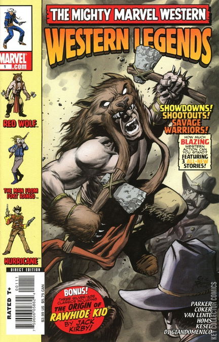 Three all-new tales of the Mighty Marvel West! Do you remember the MAN CALLED HURRICANE? Over a hundred bounty hunters and cowboys looking for revenge do. The "Fastest Man in the West" doesn't have much of a choice but to face them at once. Question is, does he have enough bullets? By Jeff Parker and Tomm Coker. RED WOLF is a considered superstition by many, but a group of thugs are about to find out how much is fiction and how much is true. Surviving their challenge is another thing all together for RED WOLF. By Karl Kesel and Carmine Di Giandomenico. Major Brett Saber is known as the MAN FROM FORT RANGO, hard-nosed leader of a rag-tag group of frontier soldiers. His unruly men are no match for a deadly band of Indians intent on holding their stronghold, but a mythical man-beast poses a deadlier threat to both sides. By Fred Van Lente and Homs. PLUS: Re-presenting the origin of RAWHIDE KID by Jack "King" Kirby!