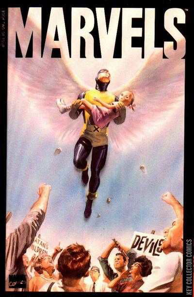 "Monsters" Written by Kurt Busiek and painted by Alex Ross, Marvels is a four-issue miniseries. It focuses on the thoughts of a news photographer named Phil Sheldon, and therefore shows Marvel's history through his eyes, and the eyes of the public. "There was something about the mutants. They were our replacements, scientists said. The next evolutionary step. We - homo sapiens - were obsolete, and they were the future." "They were going to kick the dirt onto our graves." You know these heroes inside out: the Avengers, the Fantastic Four, the X-Men - harbingers of a new epoch of Marvels. Now see them through new eyes, as an observer rather than a participant, viewing these all too familiar heroes as strangers, monsters, demigods and men. Throught the perspective of veteran news photographer Phil Sheldon, an average man suddenly on the edge of a new age, witness to a conflict unlike any the world had ever experienced before, yet with an all too familiar ring. This time, the trigger word is mutant, and the reaction is hate. Marvels - you've never lived anything like it. Gavin and Jay, the characters for whom Barney Bushkin calls, are named after Jay Gavin . Compuserve Comics and Animation Forum Awards - Best Cover (1993) - Do you remember CompuServe?? The second printing cover does not have an acetate overlay double cover like the original.