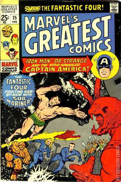 Reprints Fantastic Four #33 - Lady Dorma asks the Fantastic Four to assist Prince Namor in his battle against the hordes of the Barbaric Attuma .Reprints Tales of Suspense #67 "Where Walk the Villains" - The Deadly Dream-maker (aka Count Nefaria) creates dream illusions in which Iron Man must battle his former foes of; Jack Frost, Crimson Dynamo, Melter, Black Knight, Gargantus and the Unicorn.Reprints Tales of Suspense #59 "Captain America" - While Cap lounges around Avengers Mansion a gang of costumed thugs break in underestimating Caps abilities.Reprints Strange Tales #136 "What Lurks Beneath the Mask?" - Strange continues his search for "Eternity" until The Aged Ghenghis tells him only he and The Ancient One know the secret. He leads Strange to a being imprisoned in another dimension, but it turns out to be a trap.