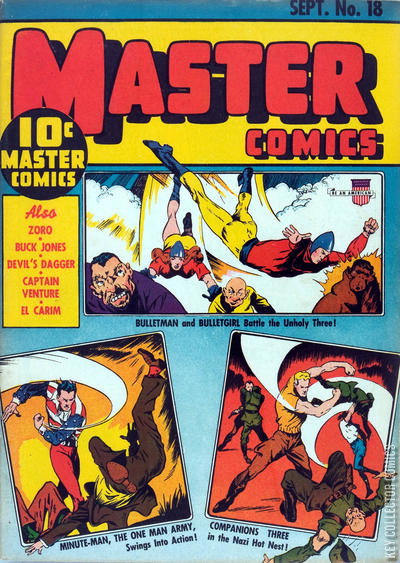 A collection of comics and stories, including -- "Return of the Unholy Three" , featuring Bulletman and Bulletgirl : The grotesque trio known as the Unholy Three is turned loose in a death-dealing coup on mighty Bulletman and Bulletgirl as they once again seek revenge on their rivals. -- "Notice to Dictators" , featuring Minute-Man : Foreign enemies are frustrated that they have thus far been unable to conquer America, so they decide to kidnap their greatest general, General Milton, who also happens to be the only one who knows that Jack Weston is really the Minute-Man. PLUS : Captain Venture, Devil's Dagger, Princess, Buck Jones, and more!!