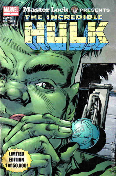 Master Lock Presents the Incredible Hulk (2003). 50,000 copy promotional edition featuring an all new story where Master Lock products Sphero, a combination lock, and Street Cuff, "the toughest bike lock on the block," join the Incredible Hulk, Elektra, Captain America, Daredevil, Ross Guildenstern, and the Kingpin in a fast-paced cross-country adventure. Ross Guildenstern gets caught up in a deadly game of cat and mouse when Wilson Fisk sets his sights on the contents in Ross' mysterious box. What is in Ross' box? A box protected by a heavy-duty Master Lock Sphero. And, why does the Kingpin of Crime want it so badly?