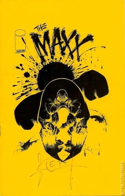 Maxx busts into the series by emerging from his cardboard box home and saves an attractive woman from her would be attackers. But when the cops show up all they find is a large purple homeless man in a purple suite. Unfortunately with the Maxx in custody it leaves the attractive woman open for Mr. GoneWhile in police custody Maxx slips into the Outback and under attack by a throng of Is. With one quick swipe the Maxx frees himself and we get our first look at the Leopard Queen.Maxx’s social worker Julie receives two phone calls; the first is a disturbing voice that Julie takes for just some ‘creep’ the second informs her of Maxx’s incarceration. Now free the Maxx and Julie spot a suspicious looking figure using phones in an unusual way.We also see Mr. Gone enter a laundry matt and leave him as he attacks another girl.Note: Also published in AshCan versions, and a Glow in the Dark variant cover.