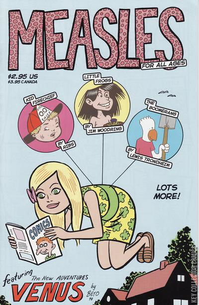 The New Adventures of Venus," script and art by Gilbert Hernandez; Venus is bugged by a man looking for a dog. "Little Frogs," script and art by Jim Woodring; Aloris is grossed out by the boys. "Nero Claudius Caesar Augustus Germanicus," script and art by Steven Weissman [as Ribs]; It's one odd fire that transports you to ancient Rome. Untitled story, script and art by Lewis Trondheim; Childhood holidays remembered. "Space On The Loose," script and art by Mario Hernandez; A boy goes out in his space suit with his ray-gun.