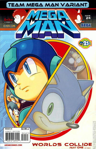 "Worlds Collide," Part One. The crossover event of 2013 starts here! The Mega Man/Sonic the Hedgehog epic kicks off with a bang as the Blue Blur and Blue Bomber meet for the first time! And considering how hard they're fighting each other, it might be the last! Why are the heroes trying to take each other down? Drs. Eggman and Wily know, and they're loving every minute of it! You cannot miss this historic first meeting of two of the biggest video game icons in the entire world! Get in on the ground floor with all-new cover art by the legendary Patrick "SPAZ" Spaziante, and choose your favorite hero with the "Team Sonic" and "Team Mega Man" variant covers!