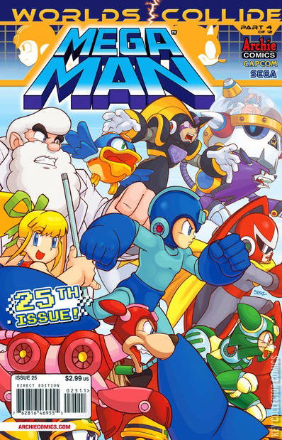 "When Worlds Collide," Part 4 of 12. It's Sonic versus Mega Man - Round Two! Celebrate 25 issues of Mega Man with the throwdown brawl to end all throwdown brawls! The Blue Bomber has the home field advantage this time; can Sonic keep up in this unfamiliar city? Meanwhile, Drs. Eggman and Wily make their boldest move yet in their master plan! This milestone issue marks the dramatic conclusion to the first act in the biggest crossover story of 2013! Featuring a stunning gatefold cover by Sonic/Mega Man art legend Patrick Spaziante, and a special "E.F.F. (aka Evil Friends Forever) variant" featuring Drs. Eggman and Wily on a (presumably evil) bicycle built for two!