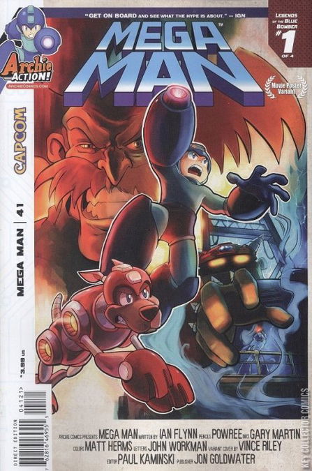 The all-new storyline begins here! The epic adaptation of the legendary game, Mega Man 3, begins with 'Legends of the Blue Bomber' Part One: We've seen Mega Man battle Robot Masters plenty of times before, but now witness the mechanical madness unfold as only the Masters' masters see it! Get a birds-eye view of battle from the lens of the great (and not-so-great) Doctors that have created our heroes and menaces! But how is this all playing into Dr. Wily's hands? Find out in this battle royale you definitely won't want to miss out on! Featuring new cover art from Patrick 'Spaz' Spaziante, plus an awesome 'movie poster' variant from Vince Riley! Note price.