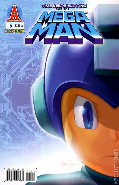 'Time Keeps Slipping,' Part 1. The evil Dr. Wily may be in jail, but that doesn't mean the adventures are over for Mega Man! Federal agents are investigating Dr. Light for ties to the Robot Masters' rampage while sinister figures lurk in the shadows. And why does Dr. Wily look so smug in his jail cell? Don't miss the beginning of the newest Mega Man adventure! Featuring a painted cover by fan favorite artist Greg Horn or a Villain cover by Patrick 'Spaz' Spaziante!