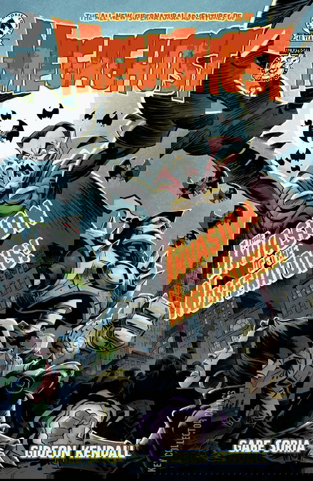 A perfect sunny afternoon turns into a nightmare of endless night when the sinister supervillain ultraghoul invites some special guests to visit the haunted hamlet of Dunwich Heights: nosferatons, space vampires from the Dark Side of the Moon! These sci-fi fiends are out to conquer the world, and only junior occultist martin magus and the supernatural giant robot megaghost can stop them . . . if the intergalactic vampire bat kaiju Drakulaar doesn’t suck them dry first! And how are teen occult detective Joanna Dee and the nefarious nethergods connected to all of this? Find out in MegaGhost Vol. 2 Issue 2, “invasion of the nosferatons!”, written by Gabe Soria and illustrated by Gideon Kendall.• Four-issue series.