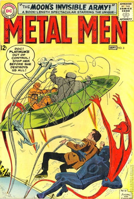Doctor Will Magnus is flooded with mail requests to rebuild Platinum. Consumed with loneliness, Platinum had constructed a robot duplicate of Magnus. In turn, the Magnus robot constructed it's own Metal Man, Plutonium, and set it to detonate. To save the world, Platinum wound herself around "Magnus" and Plutonium, binding them together. Next she wound herself around their mobile jet platform, then bound it to a departing rocket. Plutonium detonates on the Moon, destroying itself, Platinum and "Magnus". In order to reconstruct Platinum, Magnus would need to journey to the Moon, to recover vital elements of her makeup. Deeming the task too difficult, Magnus decides to build a brand new Platinum. Correcting for the earlier "flaw" in the responsometer that gave the original Platinum human emotions, Magnus builds the new Platinum as a perfect robot.The Metal Men greet the new Platinum with warm affection, only to be rebuffed by it's cold, emotionless derision. Believing that Magnus' Metal Men are faulty in their construction, Platinum suggests that Magnus take it out on a trial run. In this way, Platinum can more strongly demonstrate the proper operational parameters for machines. Mercury boils hot in the face of Platinum's assumed superiority. Tin, however, fears that Platinum will convince Magnus to scrap the Metal Men. Magnus departs with Platinum in the Metal Men's jet platform. Upon boarding the craft, Platinum nearly crushes Magnus' foot when she steps upon it. Magnus attempts to impress Platinum with the beautiful spectacle of a magnificent sunset. The Platinum robot is unmoved. A sudden updraft pitches Magnus off the jet platform.Platinum makes no move to rescue Magnus, until he specifically orders it to catch him. Platinum catches Magnus, after he has already plummeted beneath the surface of the river. Once caught, Platinum merely holds Magnus, instead of pulling him to the surface. Magnus is on the verge of drowning, when he sees Mercury and Iron descending towards...