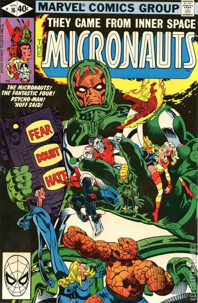 The Micronauts and the Fantastic Four fight Psycho-man in the Microverse. Complet summary (with spoiler) The Micronauts faced the gigantic owner of the huge construction where they are: Psycho-Man. Marionette is sad and furious about the fact that the Psycho-man's minions, the antrons, have destroyed Microtron, his personal robot but also his tutor and his friend. She want to fight the giant entity even if Commander Rann tells her to be prudent. Psycho-man, fond of emotions, appreciate this different ways of thinking and throw to the Micronauts a ray of fear with his control box. Immediately, the micronauts feel their personal deepest fear. Bug and Jasmine fight a reptos, a giant flying predator of Kaliklak. Arcturus Rann have suddenly a lot of doubts and cannot think to a plan or take a decision. Biotron feel the distress of his master but his own fear appear. He is attacked by a phobos, a giant humanoid robot far more sophisticated than him. Psycho-man press another button on his box and the love Acroyear and Cilicia feel for the other one is transformed into hate and they start a violent fight. Strangely, the master of emotions seems to forget Marionette. The Princess decimates a group of Antrons and attacks her enemy. In their vehicle, the reducta-craft, three of the fantastic four enter in the Microverse, Their sensors search after the object stolen in the Mr fantastic's laboratory: the armor of Psycho-man. Quickly, they make their way toward the gigantic construction, fortress of their enemy. Landed on the huge sphere, the Thing uses his mighty strength to create a hole and enter in the colossal vessel. They discover the Micronauts, fighting their personal enemies, giant-size psycho-man watching to them. The three heroes begin the fight against the minions of their mutual enemy but soon, the emotional power of Psycho-man hit them too and Acroyear, led by the hate ray, attacks Mr fantastic with his Thing-equal strength. In fact, the battle turn chaotic, the...