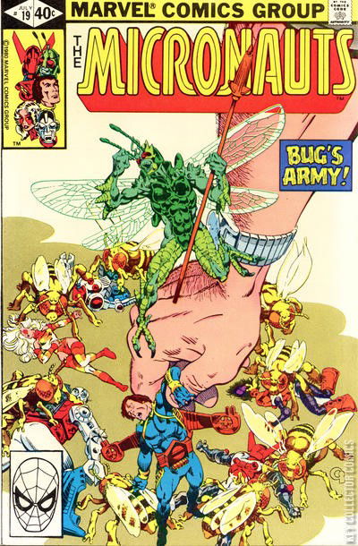 The Micronauts fights a strange human and his army of insect. Complete summary (with Spoilers) After the death of his lover jasmine, Bug had leaved his friends and had sunk in the giant vegetation of Earth (since the Micronauts are a few inches tall.) The insectoid hero travels through grass, thick like a jungle for him, and he discovers a colossal farm with some elephant-size chicken. Watching this, he is surprised by a cow big like a building. Scared of being eaten, he jumps on the back of a chicken who run for some meters. Bug jumps again on a pig’s back before crashing in a puddle, disgusted by the contact of water. Laying down in the mud, the Micronaut sees an Earth man with mad eyes coming out of the barn and watching him. Astonished by the fact that Bug is able to talk, the human tries to catch him. Bug hits the man’s hand with his rocket lance in order to stop him but the man uses a spray he is carrying on his back and stuns the little Micronaut. It's easy now for the Earth-man to put the defenseless insectivorid in a glass box among others strange insects and send a strange gas in the box. After their adventure in the dolly house (issue #18), the others Micronauts start to look after their companion. Leaded by the bug's brainwave patterns detected by Biotron, they travel to the farm where he is imprisoned. But, in an extraordinary way, some insects transmit a telepathic message to the farm where the strange human is studying insects. So he comes out of his barn and sees the Endeavor. Then he uses his spray on the spacecraft but the Micronauts's vessel is hermetic. Perseverant, he catches a pitch-fork and damages the spacecraft. Acroyear and Arcturus Rann put on their space-gliders and fly out to defend themselves but it is too late: their enemy shots the Endeavor with a shotgun. Then the human catches the commander and tells him about his life: His name is John. He is fascinated by insects since his...
