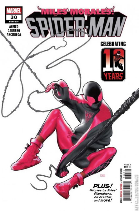 HAPPY 10th ANNIVERSARY, MILES MORALES! This is it, ten years as Spider-Man and his future has never looked brighter. A who's who of Miles Morales Spider-Creators has been webbed together to make this the best Anniversary Special of all time! MMSM TEAM-SUPREME Saladin Ahmed and Carmen Carnero show off Miles' new suit (designed by Chase Conley ) and kick off his eleventh year (AND BIGGEST ONE YET)! And the creative minds behind the Miles movies Phil Lord , Christopher Miller and two-time Oscar nominee Kemp Powers celebrate Miles' birthday in style with Miles Co-Creator Sara Pichelli ! And that's not even all the candles we're putting on Miles' cake! Don't miss this Anniversary Special! LEGACY #270