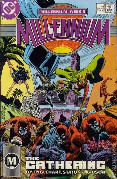 2 page text piece by Mark Waid.This is week three of DC's company-wide crossover of 1987. The Outsiders and other heroes battle the Manhunters, who were created years ago by the Guardians as a force for good, but are now dedicated to evil. The heroes must stop the Manhunters from destroying the ten special chosen ones who have been selected to advance the human race. Week 3 Crossovers: Adventures of Superman #436; Booster Gold #24; Infinity, Inc. #46; and Green Lantern Corps #220. It is implied here that Nancy Reagan is a Manhunter agent.