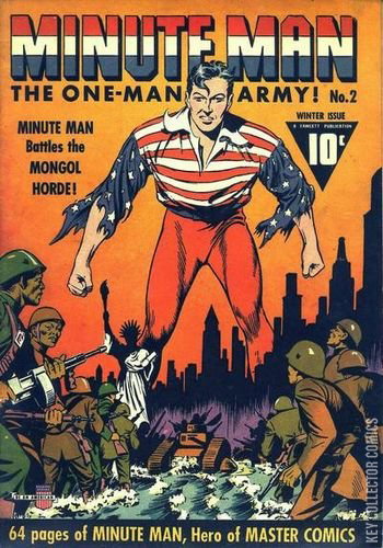 "Battles the Mongol Horde" -- What manner of human is this Genghis Khan the Second? Can a beaten world rise up from crumbling ruins to smash him? Can mighty Minute-Man, the One-Man Army, cope with him? He's got to! The monster must be crushed! "The Hooded Death" -- Sabotage from within! A dreaded menace intends to destroy America... and only a one-man army can stop it. Can Minute-Man solve the shrouded mystery of the Green Hood? He must... or else his country and all it stands for must crumble under the will of the Hooded Death! "Boss Donker's and Baron Marz's Blitzkrieg" -- A group of enlisted men receive their release papers and return to civilian life, but several of the group are quick to turn to a life of international crime and have plans to turn against America. "Saving the Panama Canal" -- Pvt. Jack Weston gets sent to help reinforce the garrison at the Panama Canal during naval maneuvers and discovers enemy plans to destroy it. Jack must once again take on his role as Minute-Man in order to save this vital lifeline of America.