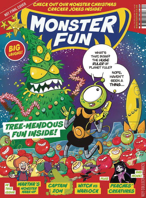 Welcome to the Monster Fun 2024 Christmas issue, an early present for all you little funsters out there! 'Tis the season to be jolly, so we are providing the laughs courtesy of Kid Kong, Sally Astro, Gums, Witch Vs. Warlock, Sir Render, Martha's Monster Make-Up, the Fright Shift and Captain Zom. If it's drama and action you want, we also have part three of Crabbe's Crusaders and bid a welcome return to our resident monster wrangler, Peaches. With her mother threatening to destroy London, Peaches will need to assemble an all new team of beasts and beings to stop her! Full of so much festive fun, including games and games, you'd be a turkey not to pick it up!