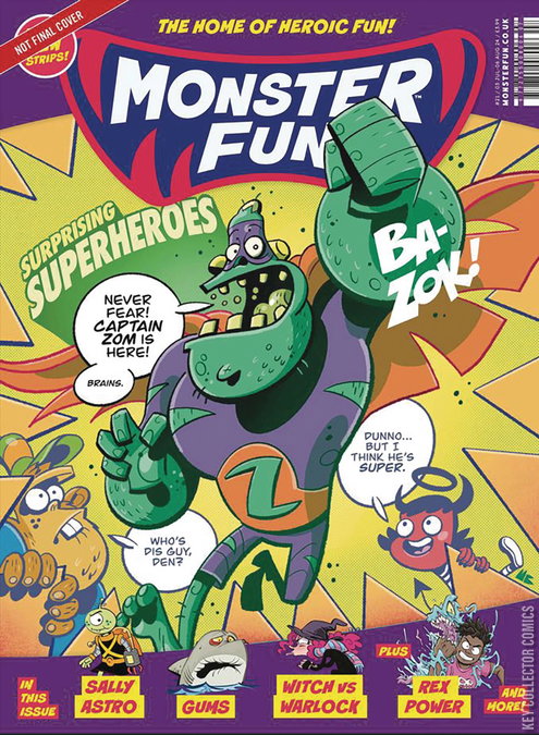 Is it a bird of prey? Is it a phantom plane? No, it's the Monster Fun July issue, jam-packed with super heroics! This summer we are celebrating all things caped and comical! Marvel as our beasts and ghouls transform into crime-busting creatures! Gums, Kid Kong, the Fright Shift crew, and Martha's Monster Make-Up, all pack a comedic punch to chase the villainous blues away! Sir Render comes face to face with Dork the Orc, and our resident prehistoric powerhouse, Rex Power, gets closer to a final show down with Zardax. We also have two new strips-meet Uniscorn, the world's most miserable unicorn, and a superhero tailored for the pages of Monster Fun�he's strong, he's fast, he's undead! It's Captain Zom!
