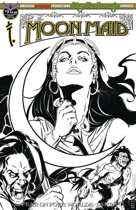 Deep beneath the crust of the Earth's moon lies a fantastic world of lush, purple vegetation, hideous monsters, the half-human/half-horse Va-gas, and the most incredible, alluring creature in the universe... Nah-ee-lah, the 'Moon Maid!' American Mythology is proud to present Edgar Rice Burroughs' immortal, sci-fi action adventure in comic book form, in all-new adventures that finds Nah-ee-lah a prisoner of the cannibalistic Va-gas, but salvation arrives in the form of two time and space-travelling adventurers from the prehistoric continent of Caspak, 'The Land That Time Forgot!' This thrilling first issue also serves as the second chapter in the 'Fear on Four Worlds' saga, which ties Burroughs' greatest fantasy worlds together into one shared universe, including Va-nah (The Moon Maid), Amtor (Carson of Venus), Pellucidar, and Caspak (The Land That Time Forgot). The Moon Maid comes with four covers - Main Cover by Mike Wolfer, Visions of the Moon & B&W Limited Edition Covers by Gabriel Rearte, and a Blank Sketch Edition.
