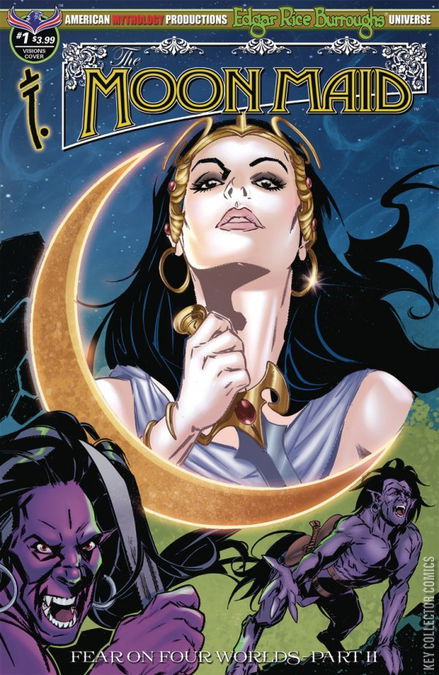 Deep beneath the crust of the Earth's moon lies a fantastic world of lush, purple vegetation, hideous monsters, the half-human/half-horse Va-gas, and the most incredible, alluring creature in the universe... Nah-ee-lah, the 'Moon Maid!' American Mythology is proud to present Edgar Rice Burroughs' immortal, sci-fi action adventure in comic book form, in all-new adventures that finds Nah-ee-lah a prisoner of the cannibalistic Va-gas, but salvation arrives in the form of two time and space-travelling adventurers from the prehistoric continent of Caspak, 'The Land That Time Forgot!' This thrilling first issue also serves as the second chapter in the 'Fear on Four Worlds' saga, which ties Burroughs' greatest fantasy worlds together into one shared universe, including Va-nah (The Moon Maid), Amtor (Carson of Venus), Pellucidar, and Caspak (The Land That Time Forgot). The Moon Maid comes with four covers - Main Cover by Mike Wolfer, Visions of the Moon & B&W Limited Edition Covers by Gabriel Rearte, and a Blank Sketch Edition.