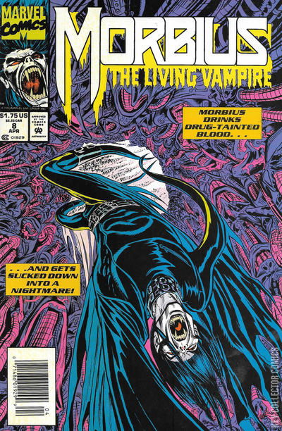 Morbius is at the Hospital and is called for a code blue. The code blue happens to be Vic Slaughter. All of a sudden a group of cops come in with a teen that was involved in a drug deal with a new drug on the market called Jazz. Later that night he goes out seeking the ones involved with the drug deals. Morbius drains the life of one of the thugs, only to find out the thug just took the Jazz drug. Morbius starts getting sick and starts hallucinating. Morbius flees back to his home only to pass out in his chamber and in his dreams, get eaten alive by Nightmare. Doctor Strange feels Morbius' cries.
