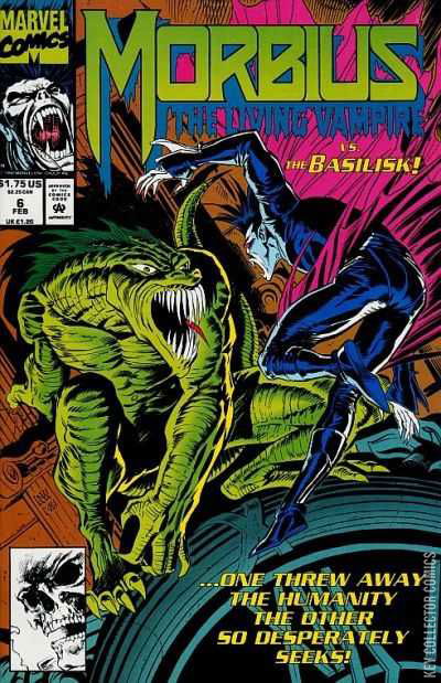 This story picks up from the last issue. Morbius and Basilisk begin to fight. During the first part of the fight, both try to use their hypnotic powers but ends in a draw. The fight then takes place in a night club while a band is playing. During the fight Basilisk tries to kill a dancer but Morbius punches him out of the way. At that point Basilsik looks at himself in a mirror and sees his human side which sickens him. While smashing the mirror, this gives Morbius the advantage to throw Basilisk out of the club away from the people. the battle then takes place roof top to roof top. Meanwhile the sun is starting to rise giving Morbius little time. The turn point happens when Morbius gets Basilisk in grasp and points his head to a window giving off his reflection. The reflections some how weakens Basilisk. While burning alive, Morbius throws a dying Basilisk into a glass building, bounces off and smashes into the street. Basilisk's body melts away into the sewer. Morbius flies away from the sun light. Back at Jacob's lab, Morbius begins to heal. Meanwhile Stroud hires Vic Slaughter an assassin to kill Morbius.
