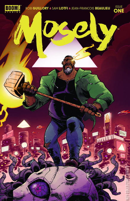 From Farmhand creator Rob Guillory and Sam Lotfi (Harley Quinn), Mosely is a satirical sci-fi blockbuster perfect for fans of God Country and Ghost Cage! In the hyper-technological world of the later 21st century, Mosely is a bitter old janitor on a mission from a higher power-to unleash holy Hell upon the 'too big to fail' Tech Gods. Can one man bring down the corporate powers who've used their vast influence to oppress an all too complacent human race (and hopefully win back the favor of his estranged family while he's at it)? Mosely's taking up the Holy Hammer and you better believe he's gonna smash some $h!t until he sets mankind free! Each issue has wall to wall content, and will feature a bonus story by series writer Rob Guillory starting with issue #2!