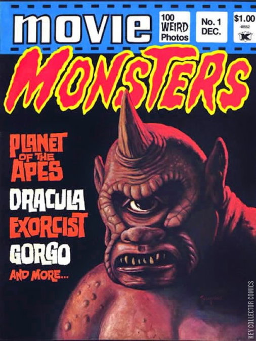 Articles on horror films illustrated with movie stills, similar to Famous Monsters of Filmland. A history of apes in film, from the silent era through the Planet of the Apes series. Articles also on: Ray Harryhausens 7th Voyage of Sinbad, Hammer Films Dracula, Mummy and werewolf pictures, The Exorcist, Gorgo, The Creature from the Black Lagoon. Other highlights include a centerfold of the Mutant from This Island Earth and an article on a Hercules movie starring some actor named 'Arnold Strong' (aka Arnold Schwarzenegger).