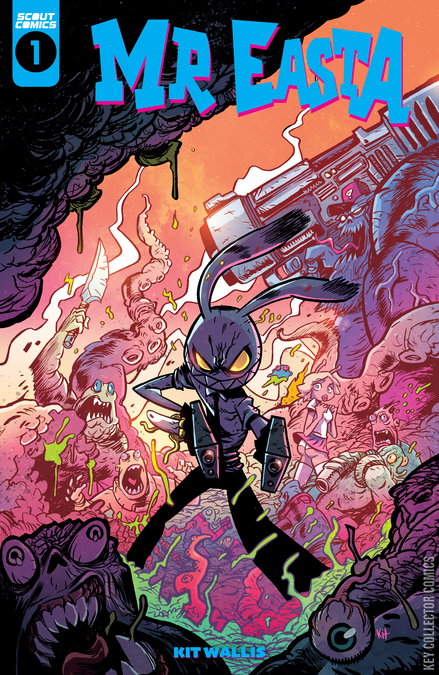 The gloriously demented mind of Kit Wallis brings the galactic adventures of the third best assassin in the universe to Scout Comics! Incredible, kinetically charged artwork blasts the blood, mayhem and quirky humor directly through your brain like a high-caliber bullet. In this issue, it's Elvis night at an interstellar backwater bar, but with all due respect to the King, that doesn't stop Mr. Easta. With the help of Frank, his teleportation parasite, who can also transform into any handheld weapon imaginable, it's business as usual.