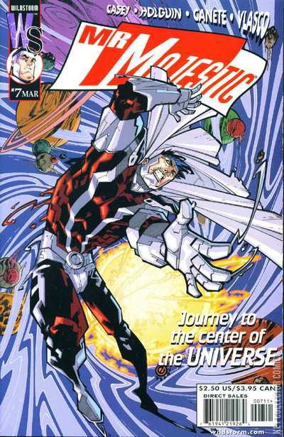 "Universal Law, Book One: Visions" A new art team debuts with Part 1 of the 3-part "Universal Law." Inhaling large quantities of toxic gases would be a bad idea for most people, but surely not a super-hero like Mr. Majestic. He could inhale those gases and expel them in the vacuum of space. No problem...right? Right? A super-hero cliche is turned on its head in MR. MAJESTIC #7, Part 1 of the 3-part "Universal Law." Written by the popular MR. MAJESTIC team of Joe Casey and Brian Holguin, the issue also marks the debut of the series' ultra-cool new art team of Eric Canete (SUPERMAN 80- PAGE GIANT #2; designer, Aeon Flux) and Juan Vlasco (Cable). To save Times Square from an airborne toxin, Mr. Majestic sucks it into his mighty lungs, planning to exhale it out of harm's way in the void. But the journey into space with the toxin inside him causes Majestic to have mysterious and surreal hallucinations, which will have serious consequences for our hero.