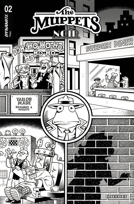 IT’S TIME TO MEET THE SUSPECTS! After succumbing to the consciousness-clobbering effects of a brick to the noggin, Kermit the Frog finds himself walking a new beat in Dreamland as private investigator Flip Minnow. His first assignment? Tracking down Meringue Crustworth, the missing daughter of pie magnate Dolores Crustworth. Seems like a straightforward enough case, but there’s something about the situation that isn’t sitting well with Flip — something that goes far beyond his inexplicably deep-seated aversion to pies. Joining forces with the friendly beat cop Officer O’Bear, the green P.I. starts running down leads, which eventually steer the pair into an oddly unappetizing pie shop that leaves Flip’s phobias untriggered. But what the flatfoot and the gumshoe discover inside turns out to be even stranger than a narcoleptic frog in a trench coat! Master storyteller ROGER LANGRIDGE continues his heart-felt return to the Muppet realm with The Muppets Noir #2 — featuring sharply shadowed covers from both the author and guest artists JAE LEE & JUNE CHUNG!