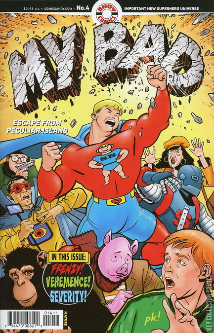 More satirical hero madness! A rival podcaster publicly challenges Jamington (The Chandelier) Winthrop to—well, the exact challenge cannot be described in polite company. Meanwhile, beaver-faced penguins look on as the villainous Emperor King buries the hatchet with former president John (Amazing) Adams! How can you not read this?