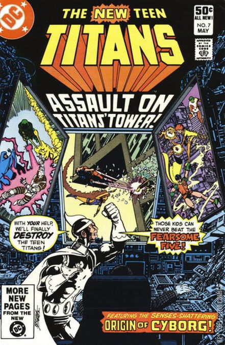 The Fearsome Five attack Titans Tower. They initially have the upper hand, because they force Victor Stone's father to divulge the secrets he knew about the tower. Silas Stone knew these secrets, because he built the tower in an effort to make up for causing the accident that turned Victor into Cyborg.Note: This issue contains the Hostess Superhero Ad, Green Arrow in "An Arrow in Time."