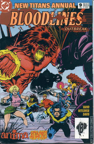 BLOODLINE: OUTBREAK PART 5 - THE RED HAND BLUES Continued from The Flash Annual #6 Two of the hideous parasites from Lobo (1993) Annual #1 are loose in New Orleans, where voodoo slayings are terrorizing the public, and a toxic waste spill brings the Titans face to face with unspeakable horror. Out of that horror grows the New Blood, Anima. Continues in Superman Annual #5