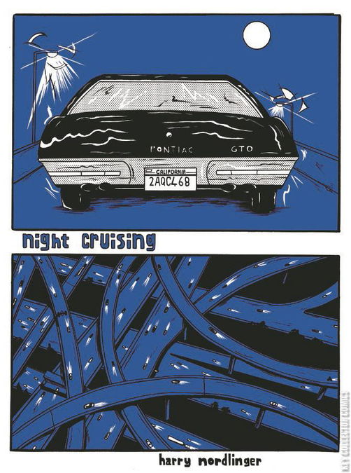 Night Cruising tells the story of Ricky, a rebellious youth, getting up to no good on the dizzying highways of LA county late at night. Written and drawn by Harry Nordlinger, Night Cruising is a dark and harrowing comic, about the things that go on in our vast urban sprawl, when everyone else is asleep. A story of lights, shadows, and everything that lives in between, told in dazzling black and white chiaroscuro.