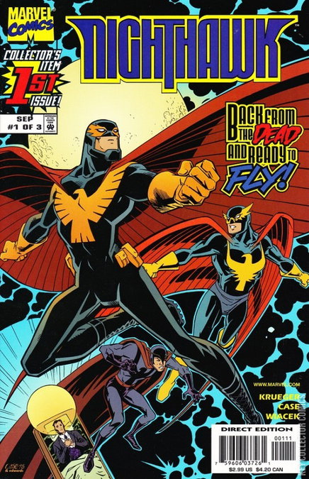 The midnight warrior rises from the grave to fly once again! He's spent the last few years in a coma, but now Nighthawk, the former Defender, is back on his feet with a new costume, new powers and a new mission -- and it's one that puts him on a collision course with Daredevil -- who happens to be Nighthawk's old nemesis back when he was a villain! And -- no lie -- it's a battle that neither hero will survive!