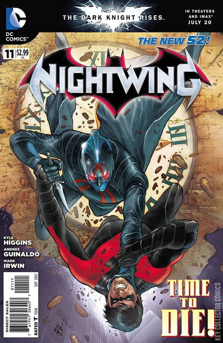 TOMORROW CAN'T WAIT The organization known as the Republic of Tomorrow has become convinced that Nightwing is responsible for the deaths of two of their members-the Strayhorn brothers. This is the same murder for which Nightwing was framed using one of his escrima sticks, and for which Detective Travis Nie has been hunting him. Led by a masked man called Paragon, the Republic attacks Nightwing, despite his claims that he is not who they think he is; that he is actually after whoever killed the Strayhorns as well. In a moment of desperation, Nightwing attaches a sonic device to the inside clock-face of the Gotham Clock Tower. The screeching noise from it sends the Republic into disarray, and covering his own ears, Nightwing tries to get to Paragon. However, Paragon uses his own weaponry to send the clock-face and the device crumbling out of their foundations and down toward the street below. Rather than allow any civilian casualties, Nightwing leaps out the hole after it, attaching explosives to the debris in the hopes that it will explode harmlessly before it can crush anybody below. his plan proves a success, but when he returns to the clock tower, he finds it empty. Nightwing decides to pay a visit to Detective Nie, who legitimately believes that the vigilante was the killer, despite Nightwing's own belief that he is being framed. As he argues with Nie, Nightwing uses his visor's computer to lock onto Nie's phone's GPS system for tracking. Meanwhile, the remains of the Republic of Tomorrow aren't satisfied with how their encounter with Nightwing went. Paragon regards his mutinous acolytes with disgust, and realizing that they can be of no use to him anymore, he kills them all. The next morning, Dick wakes up to the sound of knocking at the door. Sonia Branch, the daughter of Tony Zucco and a business woman, has come to discuss his bid for partnership in rebuilding Gotham's Amusement Mile. Unfortunately, the board has rejected his request for a loan, given the fact that his last show with Haly's Circus literally went up in flames, and nearly killed numerous spectators. Dick reacts angrily, but Sonia admits that she voted yes. It was the board who out-voted her because of the risk he posed. Offended by some of the aspersions that Dick cast in anger, Sonia leaves his apartment, slamming the door behind her. Disappointed, Dick decides to use the Batcave's computers to search for info on the Strayhorns and the Republic of Tomorrow. Robin interrupts, hearing Dick's story of how he has been framed, and comments that it is impressive enough that he didn't simply run away with his circus when he found out that he was supposed to become a Talon for the Court of Owls. Dick responds that he has no intention to run, and Damian admits that that was an important statement to make. Meanwhile, at Gotham City Police Headquarters, Deputy Mayor Kavanaugh calls a meeting with Detective Nie and Commissioner Gordon. The Commissioner states that he has placed Detective Alvarez on the Nightwing case instead of Nie. Kavanaugh warns that a lawsuit would fail, because of the Mayor's office's support. Nie exclaims that he is not framing Nightwing, and so Kavanaugh asks why Nie seems to be so obsessed with the case. Finally, Nie admits that he was in a homosexual relationship with one of the two patrolmen who were murdered by Saiko, and he blames Nightwing for what happened to him. Dick realizes something important about his case. The picture he took from the tattoo shop was taken two days before the Strayhorn brothers were murdered - but their tattoos had already been removed. Every other picture of them features the tattoos. Dick realizes that Travis Nie isn't framing him after all. Now he knows who the Strayhorn brothers were, and what got them killed. At Detective Nie's apartment, he sadly sits alone in his darkened room, looking at a photo of his lost lover. Suddenly, he is attacked by Paragon.