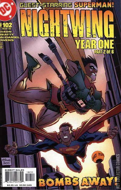 NIGHTWING: YEAR ONE CHAPTER 2 - FRIENDS IN HIGH PLACES Dick travels to Metropolis to get advice from Superman about what to do now that he is no longer Robin. Unfortunately, they are interrupted by some terrorists targeting the president. They stop the perpetrators, but Dick has to think quickly and jumps off a building with a bomb in order to reduce casualties. However, Superman catches Dick and assures him that there is a fail-safe. Afterwards, Superman shows Dick his Fortress of Solitude and tells him the legendary story of Nightwing, a Kryptonian hero who was cast out of his family. Dick tells Superman that he briefly considered having a normal life, but he always thought he would become Batman one day. Meanwhile, in the Batcave, Batman reprimands Alfred for dusting the display case of the Robin suit, and states that there won't be any more sidekicks. Dick returns to Haly's Circus, where he stops some thieves. As Dick discusses performing again, Deadman enters.