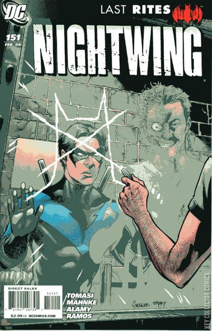 THE GREAT LEAP EPILOGUE - ...AND INTO THE BLACK Nightwing goes to Northbranch, Minnesota and, posing as a pizza delivery boy, he knocks the door of a young woman who puts on a blond wig and arms herself before opening the door. However, after seeing Nightwing through the door's fish-eye, she lets him inside and it is revealed that she is Carol Bermingham. After her near death experience, Nightwing managed to save her and hid her under a witness protection program away from New York. Nightwing tells Carol how her fake funeral convinced everyone of her death. They share some of the pizza and Carol is happy to learn that her attackers are all behind bars. Nightwing then leaves with the intention of paying them a visit. At Arkham Asylum, Nightwing talks to Two-Face and tries to make him feel remorse for his actions, but instead, Two-Face is glad that he is always going to be part of Nightwing's past, present and future. Nightwing leaves the place and tells the guards to keep a close eye on him. Some time later, Dick is back in New York and he learns that Deborah Poulos was mildly injured after the acid attack from some days ago. Dick tells her that he would pay for the best treatment he can afford and she is grateful with him. However, Deborah informs Dick that she has decided to move from New York back to California, because she doesn't feel safe enough to stay in New York. She tells Dick to come with her, but he replies that he has too many responsibilities and that he can't just leave. With a last kiss, they end their relation and each go their own way. A few days later, Nightwing meets with Superman and Green Lantern at the Valhalla Cemetery, where they are supervising the removal of all the coffins of the past heroes. Together, they travel to Washington, D.C. to the Hall of Justice, where they place all the coffins as a security measure to prevent supernatural forces to use the bodies of the fallen heroes for evil purposes. A couple of days later at the Sonoran desert, Alfred and Tim wait on a jeep for Dick, who has ascended to the stratosphere and is about to jump down to earth. Dick is about to jump off and as he gets ready to perform the great leap, he thinks of his parents and of Bruce. Dick dives down to earth and soon, he breaks the sound barrier. For a split second, Dick's breathing becomes difficult and he faints for a few moments. When he recovers, he is able to control his fall again and a few moments later, he is back on earth. Alfred is worried about Dick, but Tim reassures him as they both see Dick approaching towards them, walking. The three of them get on their way home and Alfred is sorry that nobody was present to acknowledge Dick's feat, as he had just break several world records in free fall. However, Dick tells him that he didn't do it for the recognition. Back in Wayne Manor, Alfred, Dick and Tim prepare milkshakes and pop-corn and they all go to the living room, where they watch "The Magnificent Seven". As they sit down to watch the movie, they leave Bruce's chair empty, feeling his absence.