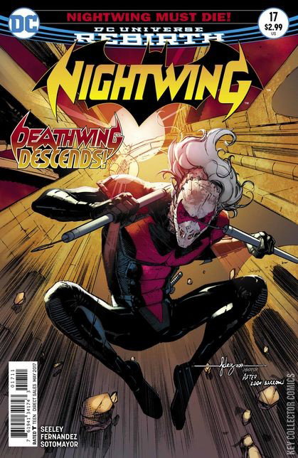 NIGHTWING MUST DIE! PART TWO Damian is travelling together with Dick, remembering one of the battles they had together when Dick took on the mantle of Batman: they faced Simon Hurt and the Joker, and he was dressed as a clown and put inside a tomb, with a scent of rotting flesh around him. And Damian thinks that experience was more pleasant than their thirteen hour voyage together in the Batmobile. They are following tracks to save the life of Nightwing's girlfriend Shawn Tsang, who is pregnant and that has been kidnapped. Damian starts arguing with Dick about the legacy of Batman: he sustains that Dick moved to Blüdhaven to establish himself as a "franchise" and a first-class superhero, and this is proved by the fact he is already called "the Batman of Bludhaven". Damian thinks he already had his run at being Batman, and that the mantle should clearly pass to him once Bruce retires. Dick is a little surprised and annoyed by the whole argument, and tells Damian that what he's doing right now is finding and saving the girl he loves, and the mother of his son. He does not want to be Batman, seeing how Bruce frantically struggles in keeping all his different lives together. Nightwing and Robin were led to Fontevraud-l'Abbaye, a village in France where the tomb of King Richard I is. Also known as Richard Lionheart, the king was the only real character inside the Adventures of Robin Hood, the book Dick read since childhood when he wanted to "escape". This means that whoever took Shawn is someone who knows him, and knows what his dreams and habits are. As they enter in the tomb, Dick scans the casket of Richard, that should be empty, but finds out it isn't. He's afraid it's Shawn, so he wants to check it out, but Damian stops him, telling him that whoever is in there has no face: he does not want Dick to see something like that. In that exact moment, a mysterious man dressed in Nightwing's old red-themed costume comes out, moving like Grayson and speaking like Grayson. It's an exact copy of him, and when he start talking, it's clear that he also has all of Dick's memories. But his character, his attitude, his feelings are like the ones Dick has always been ashamed of: it's like Dick's dark side has incarnated inside the body of another. As their opponent locks Damian inside a coffin, Dick gets cut by a knife on his forehead, and starts daydreaming about alternate versions of himself. As the criminal is about to kill him, a strange Robin with no face comes out, saving Dick's life. Soon after, Damian, the real one, manages to free himself and gets to Dick, who seeing him also sees all his alternate versions. Damian, confessing to Dick that he is afraid that when Grayson will have a son he will forget him, makes Dick come back to his senses. Together they defeat Deathwing, and discover him and the fake Robin are distorted creation of one deranged villain: Professor Pyg, who is the one who kidnapped Shawn.